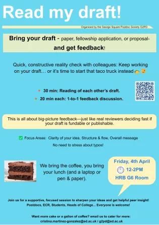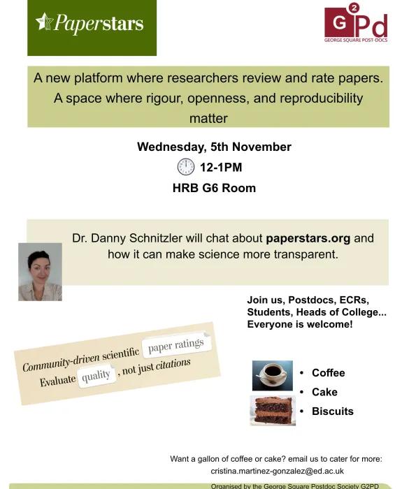 G2PD is a society for all Early Career Researchers (ECRs; PhD students, Post-docs, Research Fellows, early PI’s, etc) at the School of Neuroscience and Cardiovascular Sciences (INCR) at the University of Edinburgh. Join the comitte Join the G2PD committee!We are recruiting new committee members. We are welcome to students, postdoctoral researchers, technicians, and research fellows.Interact with institute directors, finance and research office departments while leading your initiatives. Add budget, decision-making and organisational skills to your CV. Plus, expand your professional network. Send us an email to g2pd@ed.ac.uk G2PD We support Early Career Researchers (ERCs) at INCR by promoting a positive and inclusive research culture. We organise events tailored to developing skills, identifying career opportunities and building networks.We bring colleagues from across different career tracks closer, facilitating conversations around the challenges and opportunities for ERCs, raising awareness on the full breadth of academic and adjacent roles of research. Email us to: g2pd@ed.ac.uk or join our mailing list: g2pd@mlist.is.ed.ac.uk G2PD committee Hello there Dr Constantinos Eleftheriou Postdoctoral Researcher - Duguid lab Dr Cristina Martinez Gonzalez Postdoctoral Researcher - LSM3D DR Francesco Gobbo Postdoctoral Researcher - Morris lab News and Events Our latest news and events. Lunch talk: Paperstars, Goodreads for SciencePaperstars is a new platform where researchers can review and rate published papers. To move beyond quantitative metrics and instead create a space where rigour, openness, and reproducibility are what matter.Join us at 12 PM on the 5th November @G6 for coffee, biscuits, and to meet the founder of this amazing project:During my lunchtime talk, I’ll share a bit about why I started Paperstars, how it works (e.g. weighted parameters, star ratings, short reviews, etc.), and how we’re hoping it can make science more transparent and supportive for researchers at all stages. I’d love this to be a conversation. I want to hear your thoughts on what works, what doesn’t, and what a fairer evaluation system for science could look like.Danny Goodbye to Bri and Sooraj This year, we bid farewell to Brianna Vandrey and Soraj Nair, who are embarking on new academic journeys beyond Edinburgh. I want to extend our gratitude to them for their contributions, especially to Bri, who successfully led the society and its many achievements for several years. ‘Postdoc Appreciation Week’ Awards Congratulations to Dr Cristina Martinez Gonzalez, member of the G2P2 committee, for winning the Citizenship ‘Postdoc Appreciation Week’ Award. Also, congratulations, Dr Christina Brown (Miron lab), a previous member of the G2P2 committee, runner up for the same category! Welcome Constantinos and Sooraj We want to welcome Constantinos and Sooraj to the G2PD committee. Looking forward to working with you!Bri, Francesco and CristinaJune 2024 Previous events Our previous events Lateral Moves THE BIG POSTDOC QUIZ Congratulations to the winning team! Meet and greet event New PIs Round Table Thursday, June 6th, 2024. G2PD Team announce "Picture that Research" - our first Postdoc Image Competition Postdoc Seminar Series BIG FAT POSTDOC QUIZ G2PD host first Postdoctoral Retreat Previous Committee Members Previous G2PD committee members Dr Christina Brown, Dr Sara Pearce, Dr Anna Motyl, Dr Antonios Asiminas, Dr Idoia Quintana-Urzainqui, Dr Vrushali Patil, Dr Alfredo Gonzalez Sulser Contact details Email: g2pd@ed.ac.uk This article was published on 2024-07-17