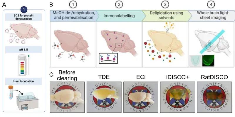 Our scope: Project designOptical clearing (RatDISCO, iDISCO and CLARITY)Whole brain Light-sheet microscopy imaging Consultation on image analysis (FIJI, QUINT, Arivis) RatDISCO We have developed a tissue processing protocol to efficiently and effectively optically clear and immunolabel whole rat brains: RatDISCO (Edinburgh Innovation disclosure application EI0000698). Contact us Please get in touch with us for a detailed quotation:cristina.martinez-gonzalez@ed.ac.ukkirsty.craigie@ed.ac.uk Dr Cristina Martínez González Reseach Fellow and Facility Manager Contact details Email: cristina.martinez-gonzalez@ed.ac.uk Web: Website Kirsty Craigie Senior Technical Officer Contact details Email: kirsty.craigie@ed.ac.uk Useful links Dodt, H.-U. et al. Ultramicroscopy: three-dimensional visualization of neuronal networks in the whole mouse brain. Nat. Methods 4, 331–336 (2007).Ye, L. et al. Wiring and Molecular Features of Prefrontal Ensembles Representing Distinct Experiences. Cell 165, 1776–1788 (2016).Renier, N. et al. IDISCO: A simple, rapid method to immunolabel large tissue samples for volume imaging. Cell 159, 896–910 (2014).Ueda, H. R. et al. Tissue clearing and its applications in neuroscience. Nat. Rev. Neurosci. 21, 61–79 (2020). This article was published on 2024-09-09