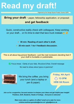 Read my Draft! Read my draft flyer Quick, constructive reality check with colleagues: Keep working on your draft… or it’s time to start that taco truck instead🌮😉🔸 30 min: Reading of each other’s draft.🔸 20 min each: 1-to-1 feedback discussion.✅ Focus Areas: Clarity of your idea, Structure & flow, Overall messageNo need to stress about typos or grammar! This is all about big-picture feedback—just like real reviewers deciding if something is fundable or publishable.We bring the coffee, you bring your lunch (and a laptop or pen & paper).Join us for a supportive, focused session to sharpen your ideas and get helpful peer insight!Postdocs, ECR, Students, Heads of College... Everyone is welcome! Want more cake or a gallon of coffee? email us to cater for more:cristina.martinez-gonzalez@ed.ac.uk / g2pd@ed.ac.uk Apr 04 2025 12.00 - 14.00 Read my Draft! Bring your draft - paper, fellowship application, or proposal- and get feedback from a colleague! HRB G6 room